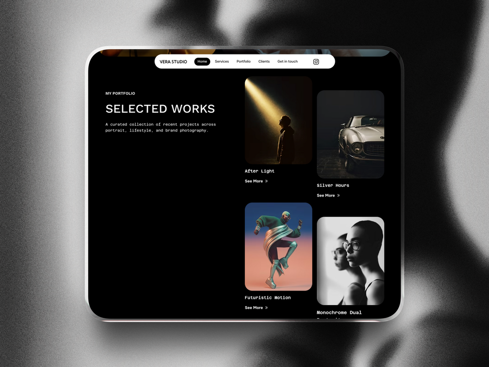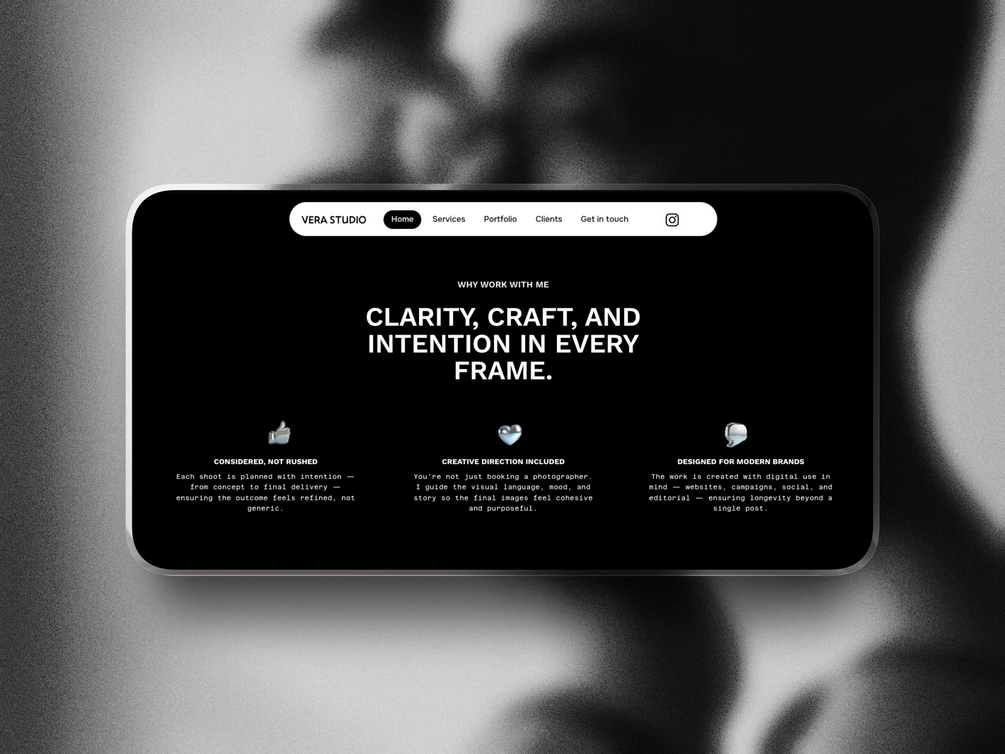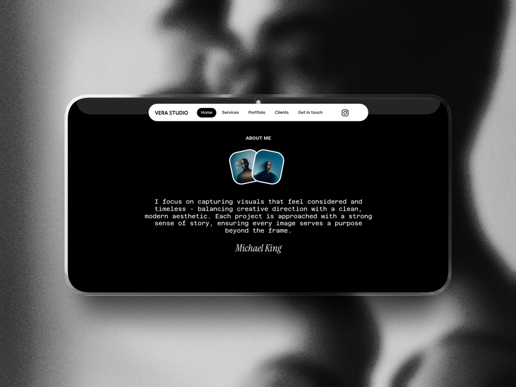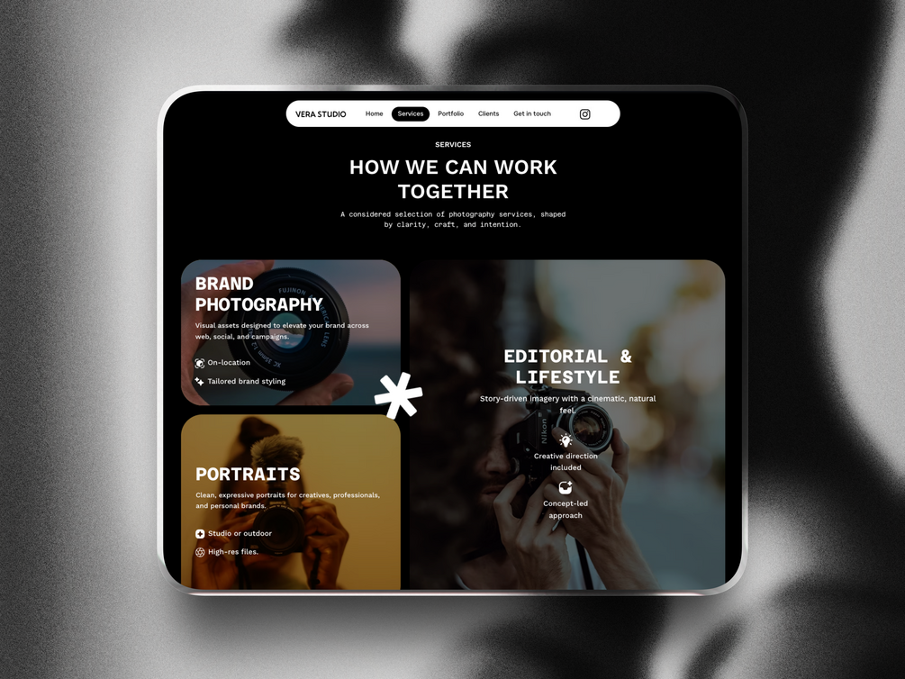 This template is a modern, design-led website built for creative studios, photographers, agencies, and service-based brands that want a polished online presence without the cost of a full custom build.